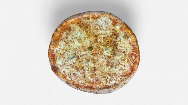 pelati, mozzarella, gorgonzola, dimljen sir, parmezan, origano, oliva