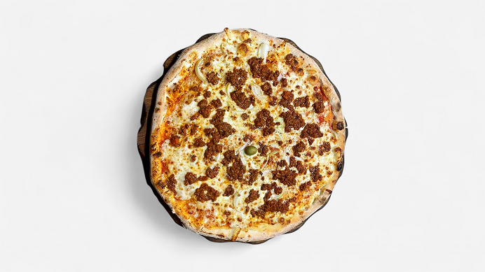 pelati, mozzarella, mesni ragu, čebula, origano, oliva