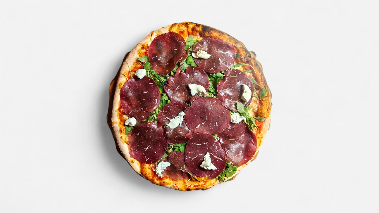 pelati, mozzarella, stracciatella, bresaola, rukola, parmezan, origano, oliva