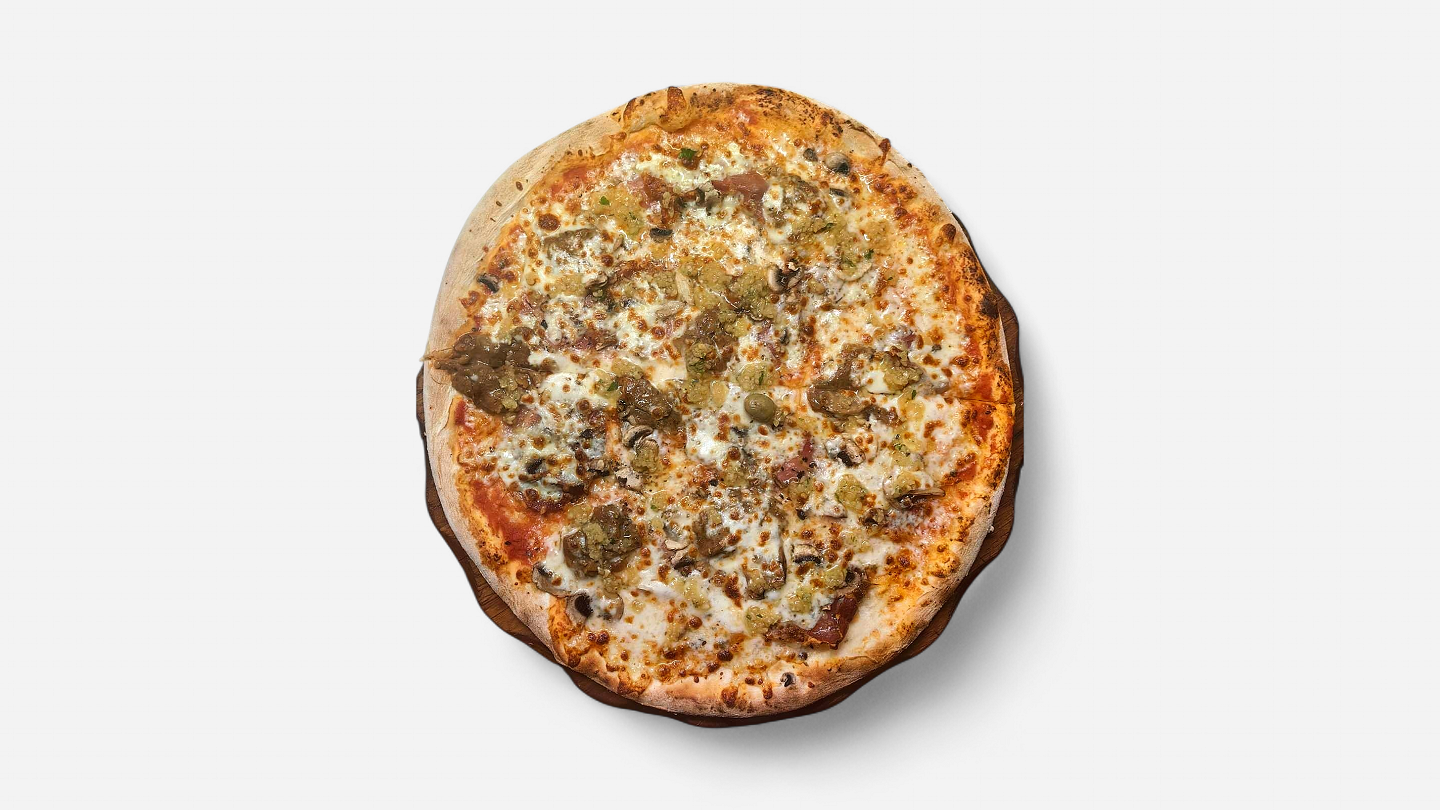 pelati, mozzarella, šampinjoni, jurčki, pečen pršut, tržaška omaka, origano, oliva