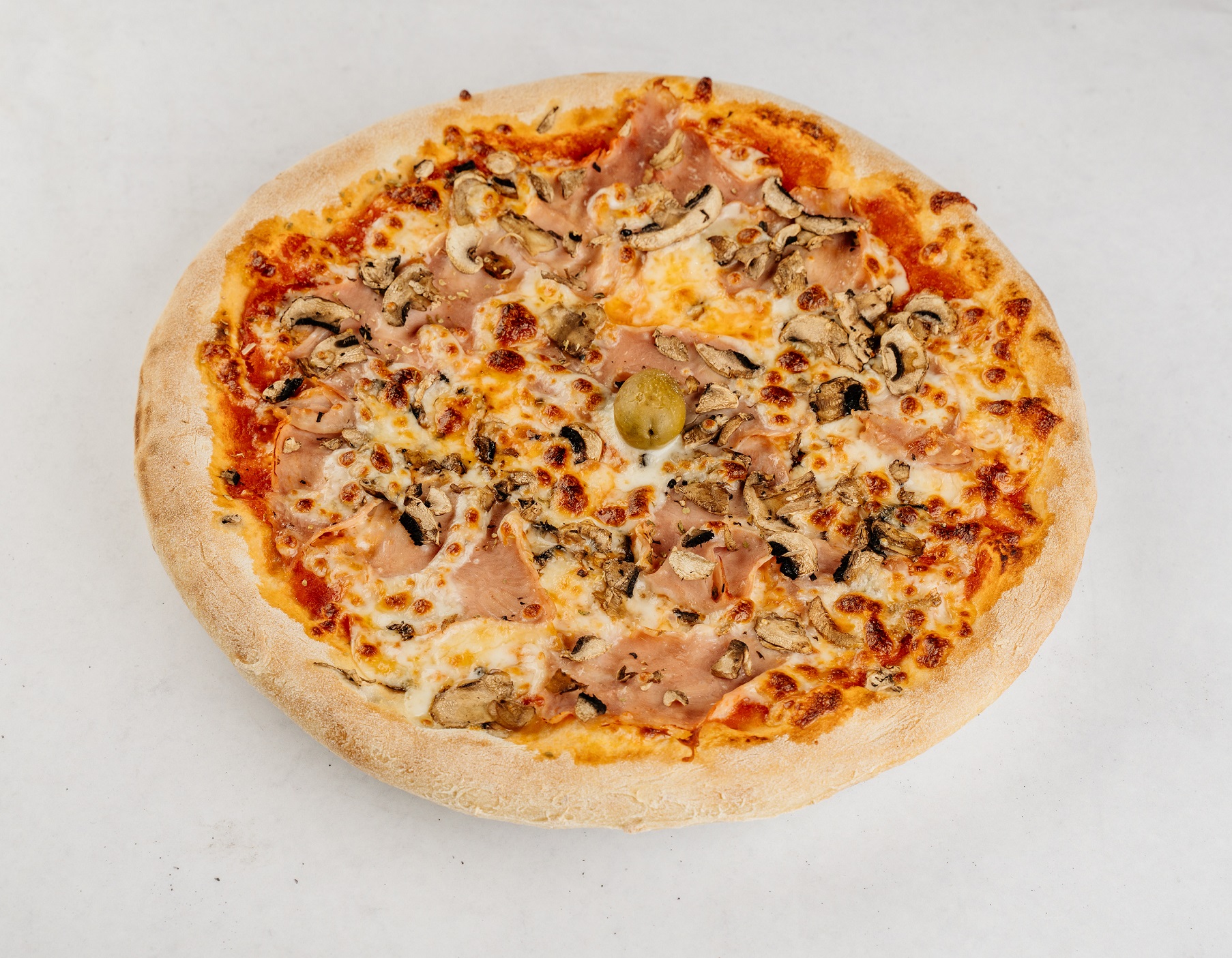pelati, mozzarella, kuhan pršut, gobe, origano, oliva