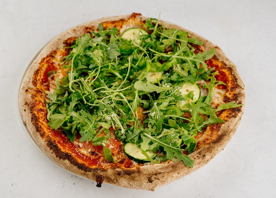 pelati, mozzarella, paprika, bučke, svež paradižnik, rukola, parmezan, olivno olje, origano, oliva