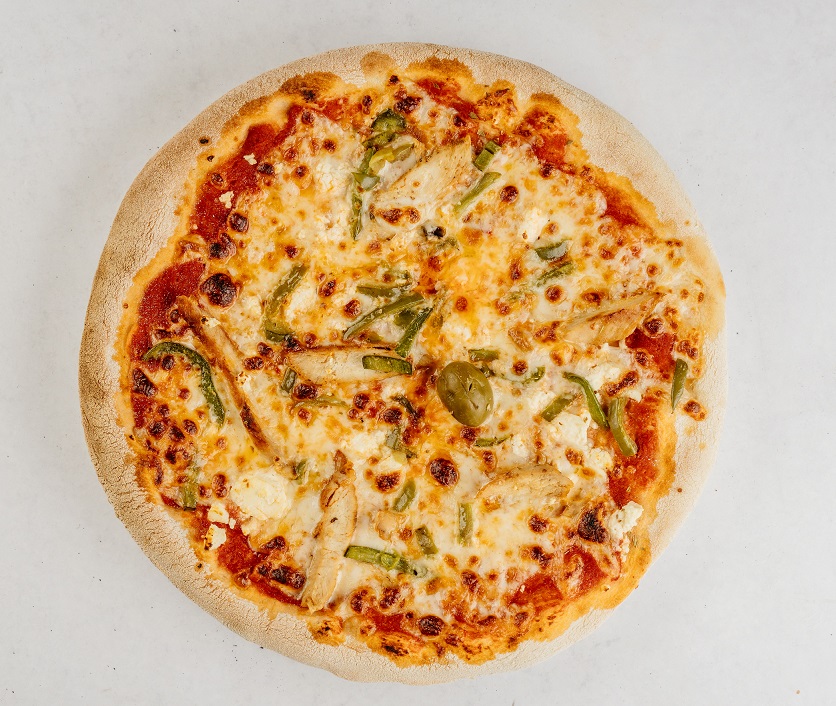 pelati, mozzarella, piščanec, feta sir, paprika, origano, oliva