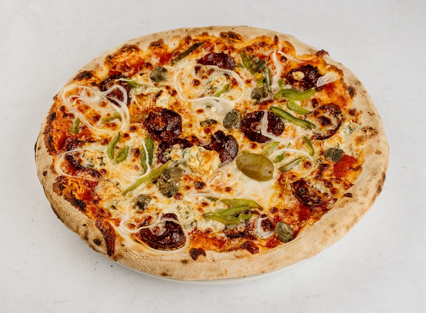 Mlekopelati, mozzarella, goveja suha salama, gorgonzola, čebula, paprika, kapre, origano, oliva