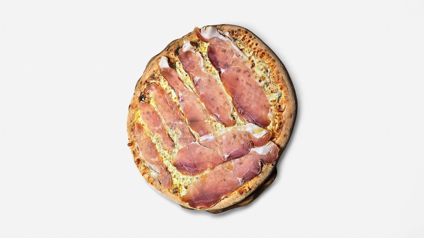 smetana, mozzarella, vmešano jajce, tartufata, pršut, tartufovo olje, origano, oliva