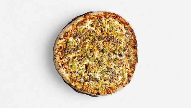 pelati, mozzarella, tuna, čebula, tržaška omak, koruza, origano, oliva